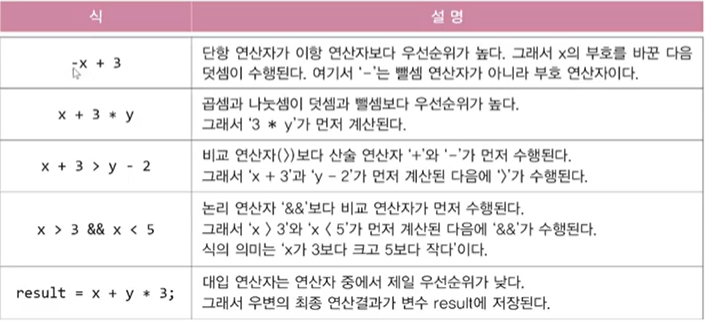 2. 단항(1) > 이항(2) > 삼항(3). 단항 연산자의 우선순위가 이항 연산자보다 높다.