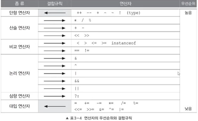 3. 단항 연산자와 대입연산자를 제외한 모든 연산의 진행방향은 왼쪽에서 오른쪽이다.