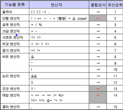 - 연산자의 결합규칙은 왼쪽에서 오른쪽 순서이지만, 대입연산자는 오른쪽에서 왼쪽으로 진행된다.