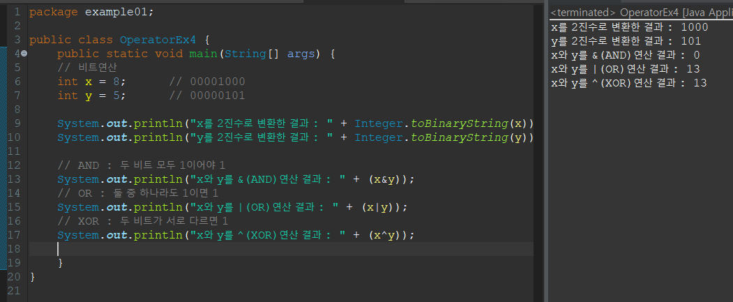 - 비트연산자는 어떤 변수의 값을 0과 1의 조합, 즉 비트로 변환한 뒤에 비트단위로 연산을 수행한다.
