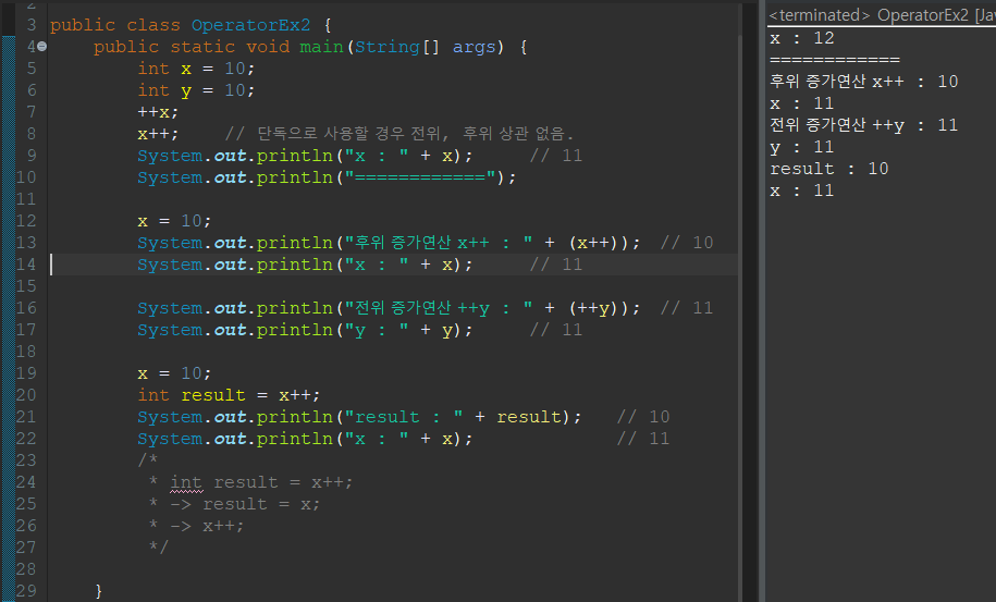 - 전위형과 후위형 모두 피연산자의 값을 1 증가 또는 감소시키지만 증감연산자가 수식이나 메소드 호출에 포함된 겨웅우 전위형일때와 후위형일때의 결과가 다르다.