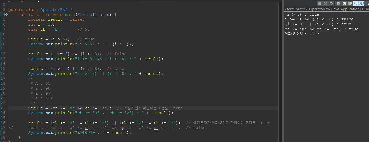 - 주로 조건문과 반복문의 조건식에 사용되며, 연산결과는 오직 true or false이다.