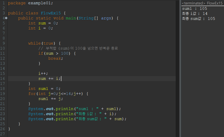 - break문은 자신이 포함된 가장 가까운 반복문을 벗어나며 주로 if문과 함께 사용되어 특정 조건을 만족하면 벗어나도록 하게 하는 예약어이다.