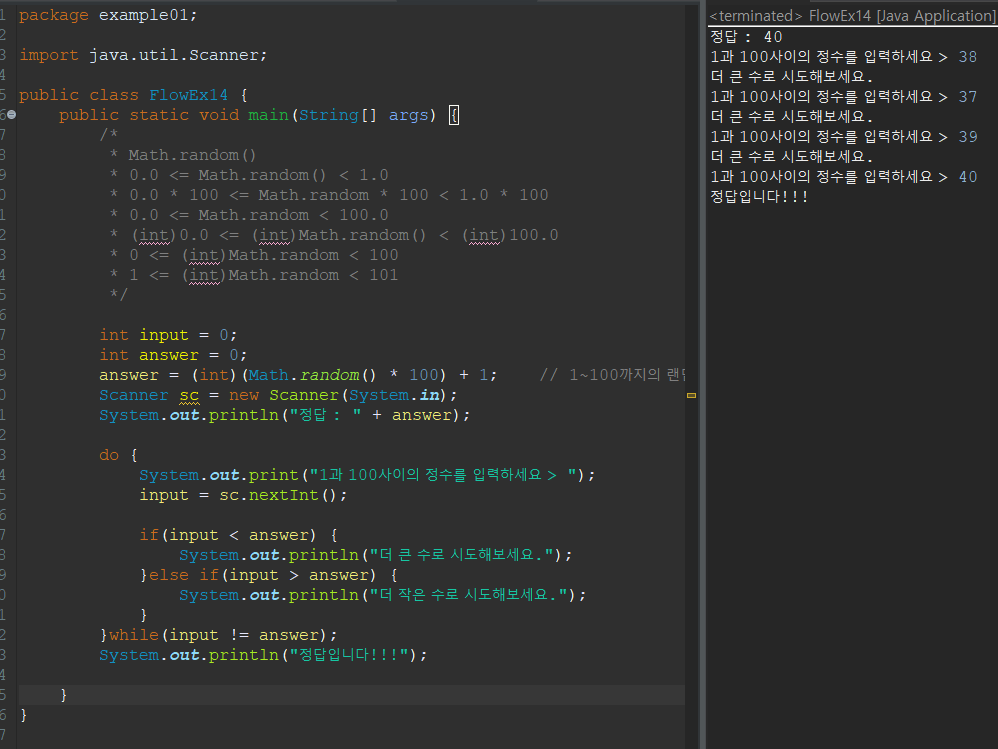 * 지금까지 코드의 실행 흐름이 무조건 위에서 아래로 한 문장씩 순차적으로 진행되었지만, 때로는 조건에 따라 문장을 건너뛰고, 때로는 같은 문장을 반복해서 수행해야 할 때가 있다. 이처럼 프로그램의 흐름(flow)을 바꾸는 역할을 하는 문장들을 제어문이라고 한다.