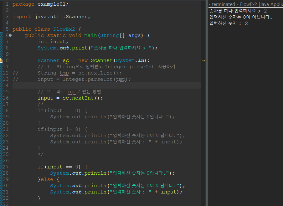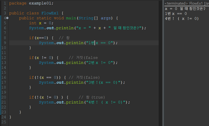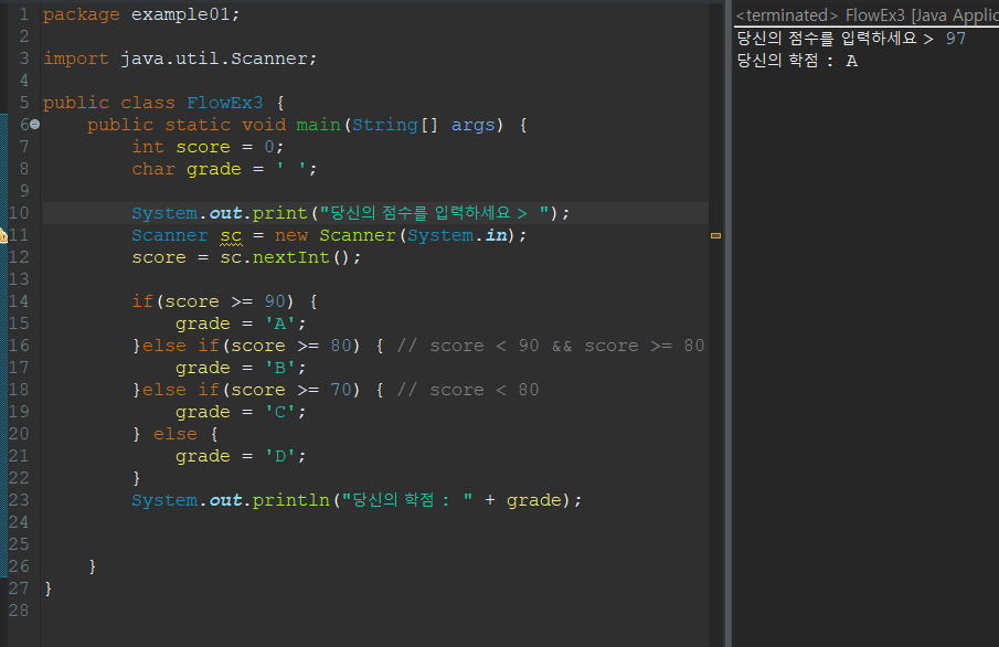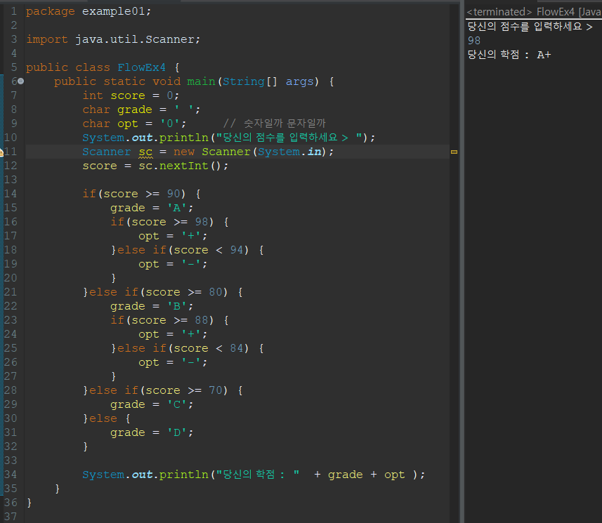 - if문에 사용되는 조건식은 일반적으로 비교연산자와 논리연산자로 구성된다.