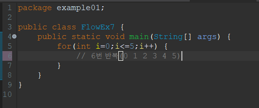 - 매 반복마다 변수의 값이 증감식에 의해서 점진적으로 변하다가 결국 조건식이 false가 되어 for문을 벗어나게 된다.
