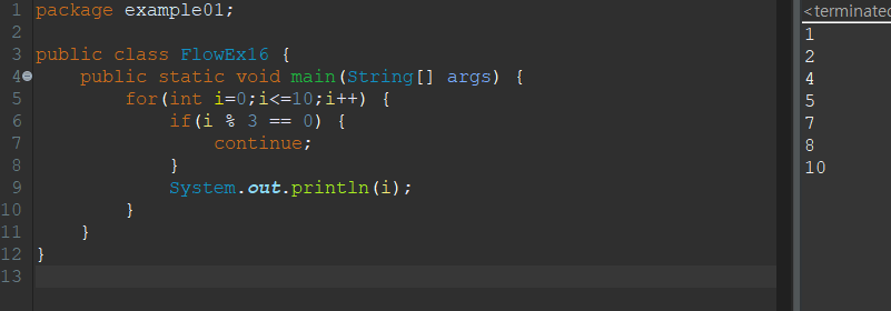 - continue문은 반복문 내에서만 사용될 수 있으며, 반복이 진행되는 도중에 continue를 만나면 반복문의 끝으로 이동하여 다음 반복으로 넘어간다.