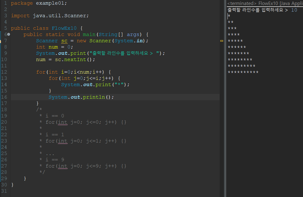 => 제일먼저 초기화가 수행되고, 그 이후부터는 조건식이 참인 동안 조건식 -> 수행될 문장 -> 증감식의 순서로 계속 반복된다. 그러다가 조건식이 거짓(false)가 되면 for문 전체를 빠져나가게 된다.