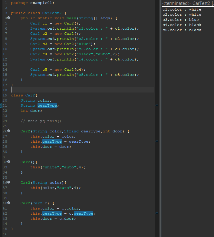 - 같은 클래스의 멤버들 간에 서로 호출할 수 있는 것처럼 생성자간에서 서로 호출이 가능하다.
