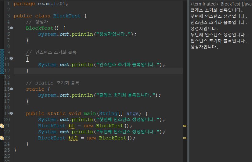 - 초기화블록 작성 시 인스턴스 초기화 블록은 단순히 클래스내에 블록{}을 만들고 그 안에 코드를 작성하기만 하면된다.