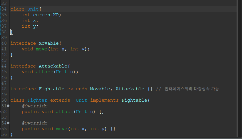 - 인터페이스는 인터페이스로만 상속받을 수 있으며 클래스와 달리 다중상속, 즉 여러개의 인터페이스로부터 상속받는 것이 가능하다.