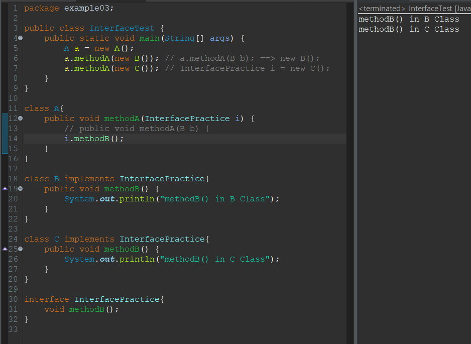 - 즉, 인터페이스는 메소드의 매개변수의 타입으로 사용될 수 있으며, 메소드의 리턴타입으로 인터페이스 타입을 지정하는 것도 가능하다.