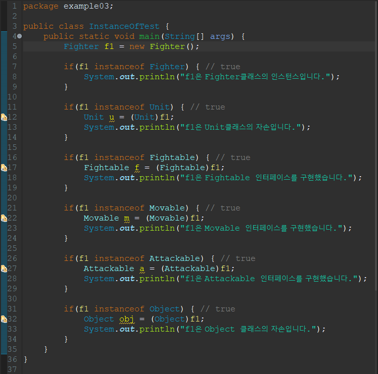 - 인터페이스 역시 이를 구현한 클래스의 조상이라 할 수 있으므로 해당 인터페이스의 타입의 참조변수로 이를 구현한 클래스의 인스턴스를 참조할 수 있으며, 인터페이스 타입으로의 형변환도 가능하다.