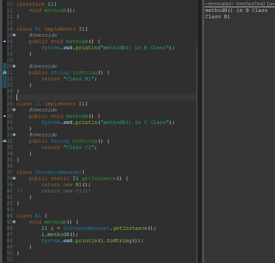 - 인터페이스도 추상클래스처럼 그 자체로는 인스턴스를 생성할 수 없으며 추상클래스가 상속을 통해 추상메소드를 완성하는 것처럼 인터페이스도 자신에게 정의된 추상메소드의 몸통을 만들어주는 클래스를 작성해야 하는데 그 방법은 추상클래스가 자신을 상속받는 클래스를 정의하는 것과 다르지 않다.